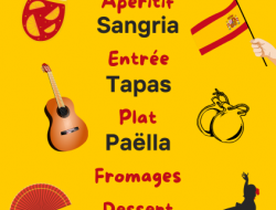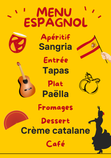 On commence bien sûr avec une sangria accompagnée de tapas (tortilla, brochette d'olives-anchois-poivron, jambon cru, moules et gaspacho), on continue avec une paella et on termine avec une crème catalane !